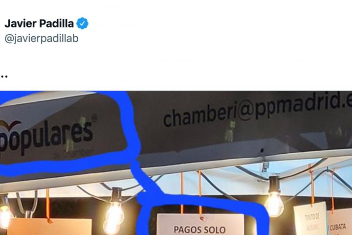 Entre los que se encontraban disfrutando de las fiestas estaba el diputado de Más Madrid en la Asamblea Javier Padilla, que no pudo evitar fijarse en lo que se podía ver en la caseta del PP.