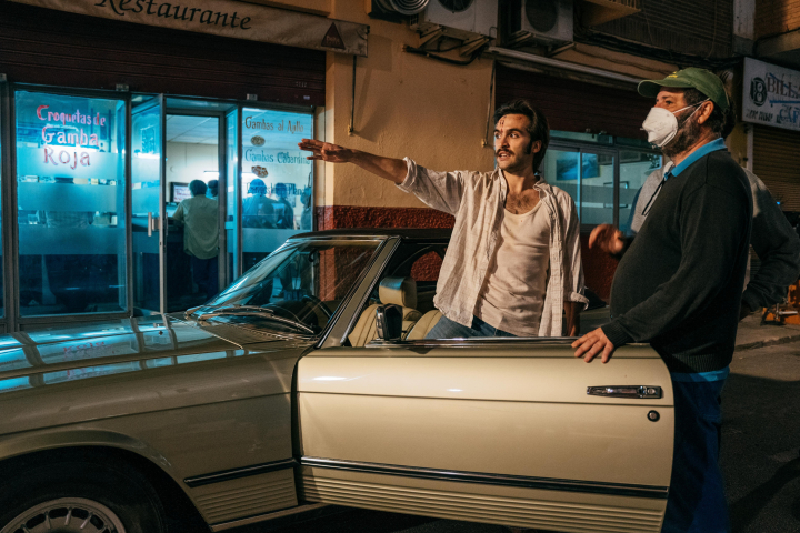 Ricardo: Alcoholismo incipiente (entre risas). Si, fue nuevo para mí, todo, tanto las armas como el alcoholismo (entre risas). Es un gusto para cualquier actor poder interpretar un personaje que tiene tantas capas emocionales, tan distintas, capa sobre capa, de lo que realmente es él y de lo que realmente siente con todo lo que se ha construido para poder sobrevivir en su entorno y en un contexto social y temporal muy concreto. Toda esa carcasa que teníamos que construir, pero sin olvidarnos de que por dentro era una persona sensible y emocional, pero por fuera, la sensación de un tipo áspero y duro, que no tiene amigos y que no tiene la intención de tenerlos, como tú decías, con unos problemas de infancia muy marcados, la orfandad, haberse criado en Paracuellos, el alcoholismo incipiente de alguien que es muy obsesivo y que tiene una cosa a lo que agarrarse, que son sus chicles, y cuando no, el coñac, su arma, el coche. Óscar quería construir un tipo muy concreto que tenia en la cabeza y que, bueno, al final el gusto de poder trabajar con alguien que sabe muy bien lo que quiere y que te ayuda a ir hacia un sitio muy concreto y que te ayude a construir el personaje