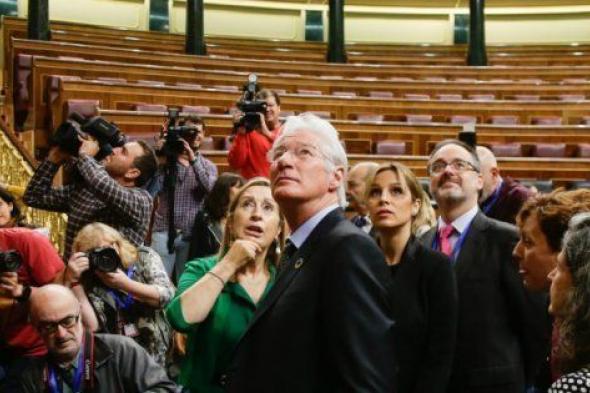 Gere, que ayer se reunió en el Palacio de la Moncloa con el presidente del Gobierno, Pedro Sánchez, ha estado acompañado en su visita en la Cámara Baja por la presidenta del Congreso, Ana Pastor, que le ha explicado con detalle algunas de las pinturas y esculturas que adornan el hemiciclo.