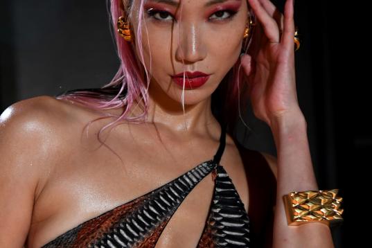 Los ascensores han dado para mucho, y si no que se lo digan a Lourdes Leon. La hija de Madonna es otra de las estrellas del desfile y ha caminado por los pasillos del hotel hasta el ascensor, donde una cama redonda con sábanas plateadas la esperaba. La joven ha vestido parte de las prendas de látex de la colección, con un conjunto verde y unas botas que llegaban hasta la mitad del muslo.