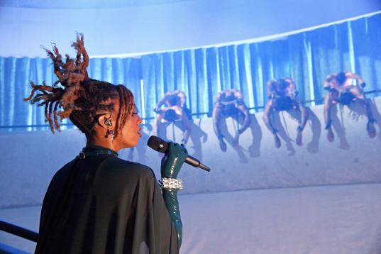 Además de ser el cerebro detrás de los tejidos, looks imposibles y del engranaje del espectáculo, Rihanna también se concede su minuto de gloria luciendo sus diseños. Primero bailando en un sofá bajo el misterio de unas luces rojas con un conjunto a juego en estampado animal, que combinó con medias de encaje. Después, cómo no, aparece en un ascensor con un mono negro para subir a la azotea y despedir el desfile con la luz del amanecer.