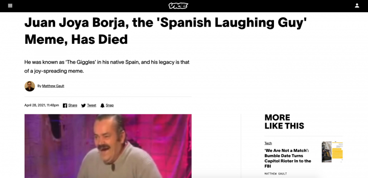 “La historia lo dejó a él y al presentador dando palmadas sobre el escritorio en un ataque de risa incontrolable, con la característica sonrisa jadeante y casi desdentada de Borja”, describe la BBC. “Su cara sonriente sigue siendo popular en internet hoy en día e incluso se usa como un emoticono en la plataforma Twitch”, añade.