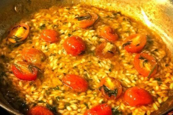 Pasar el arroz a platos planos repartiendo los tomates de forma armoniosa. Espolvorear con pimienta negra el resto de romero.