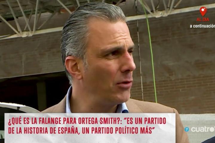 Uno de los reporteros del programa preguntó a Ortega Smith qué opina sobre la Falange en un acto celebrado en el ensanche de Vallecas, en Madrid. El político del partido de ultraderecha aseguró que para él, Falange es “un partido de la historia de España, un partido político más”.