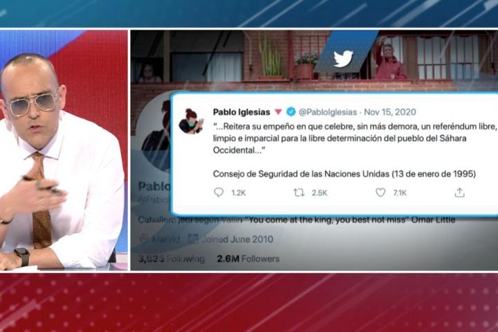 ″¿Qué pensaríais si un vicepresidente de Francia o de Portugal exigiese un referéndum para Cataluña?”, ha preguntado Risto justo antes de mostrar un tuit de Pablo Iglesias de noviembre de 2020 en el que citaba un texto del Consejo de Seguridad de Naciones Unidas sobre un referéndum en el Sáhara Occidental.