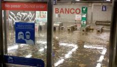 En la estación de Banco de España, situada en la calle de Alcalá, es donde más se han notado los efectos de la borrasca Efraín ya que la intensa lluvia se ha colado con fuerza hasta el vestíbulo dejándolo completamente anegado, según muestran diversos vídeos captados por ciudadanos y que circulan por redes sociales en los que se ve cómo el agua discurre como si fuera una cascada por las escaleras de entrada y convierte en una piscina los interiores.