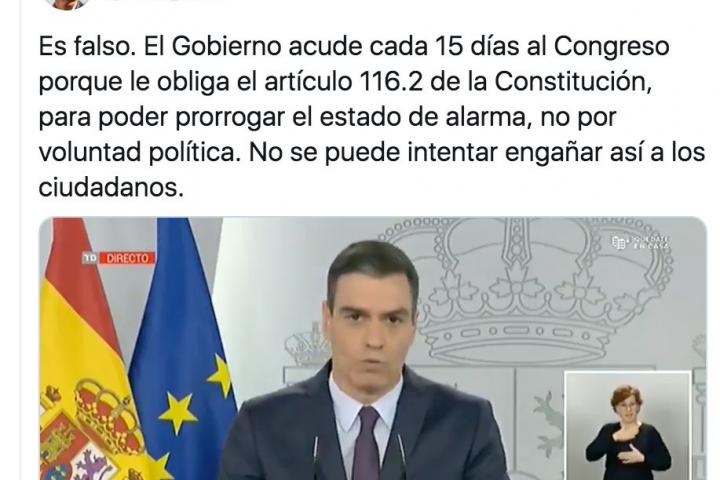 Sin embargo, Rivera comete un grave error, ya que lo que dice no es cierto. El Gobierno sólo estaba obligado a acudir al Congreso 15 días después de la primera declaración de estado de alarma. Después, puede prorrogar esta situación el tiempo que considere.
