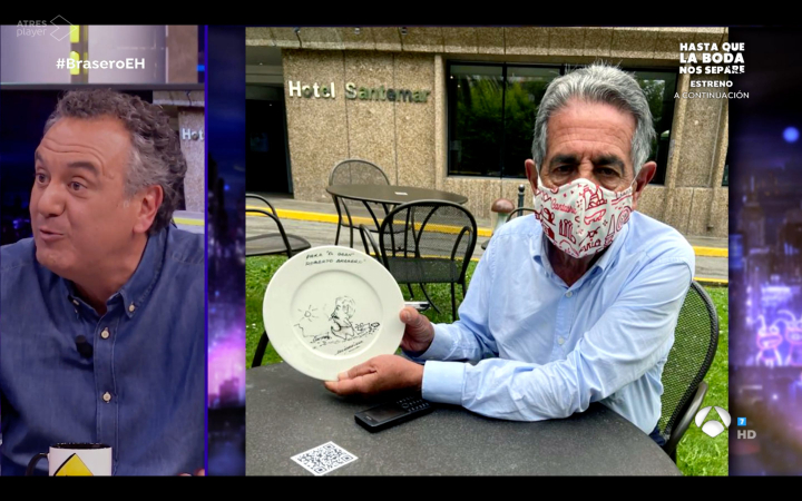 Después ha explicado que se encontró con el presidente cántabro en Santander, donde él veranea, comiendo en un restaurante. “Pasó una cosa muy curiosa”, ha empezado diciendo, para añadir que le hizo un dibujo “a vuela pluma” en un plato de sí mismo.