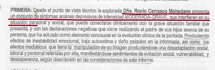 “Doña Rocío Carrasco Mohedano presenta un conjunto de síntomas ansioso depresivos de intensidad MODERADA-GRAVE, que interfieren en su situación personal y social, que puede conectarse clínicamente con la grave situación que presenta”, se recoge en el informe. Que también añade: ”(...) Se hace recomendable el establecimiento de medidas de protección que limite la exposición mediática de las cuestiones intrafamiliares”.