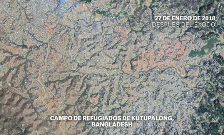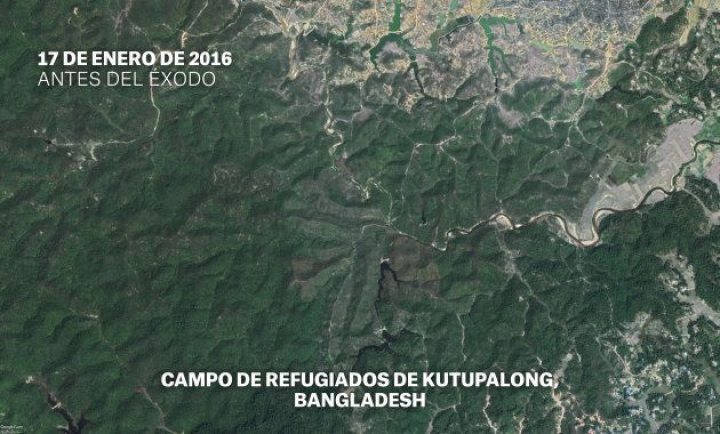 En estas imágenes difundidas por Médicos Sin Fronteras (MSF) se puede apreciar el antes y el después del éxodo en la zona de Kutupalong, que oficialmente alberga el mayor campo de refugiados del mundo, por delante del de Zaatari, en Jordania.