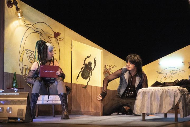 Y como esos productos de tebeo, cómic o manga gamberro, esta historia tiene todo lo que hay que tener. Un malo malísimo, el Dr. Arthur, un científico ultraliberal con amplias conexiones con la escuela de Chicago que, como ya saben los que hayan visto Shock 1 en el Centro Dramático Nacional, son unos malos malísimos. Un héroe protagonista, Eduardo Martín Felguera, un ‘pringao’ de barrio que provee de servicios soft sadomaso para bujarrones ancianos. Una heroína, una outsider, ciberactivista y hacker, vendida a una multinacional, aunque el sueldo no le da más que para vivir en una mínima buhardilla muy abuhardillada llena de tecnología de aspecto cutre. Y un conejo rojo que está alojado cerca del hipocampo de Eduardo Martín Felguera. Ah, y Siri, ese device de inteligencia artificial que ya no puede faltar y que tanto placer, incluso sexual, es capaz de dar.