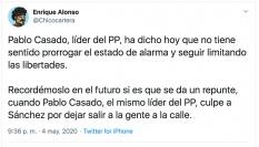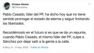 Villacastín ha escrito un mensaje citando al propio Casado en la que carga duramente contra él por lo que ha dicho sobre Sánchez: “A eso se llama IRRESPONSABILIDAD. Ha olvidado que votó en el Congreso contra ampliar el Estado de Alarma. Un jefe de la oposición no puede ser tan inconsciente, con lo que estamos viviendo y la gente sufriendo”.