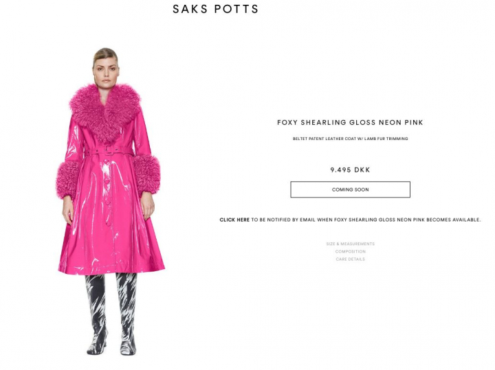 La diferencia de las tres fotos, además del texto que las acompañan, son los colores de este modelo de abrigo de la marca danesa Saks Potts: rosa, blanco y naranja. Todos se encuentran en la web de la firma por 1.272,16 euros.