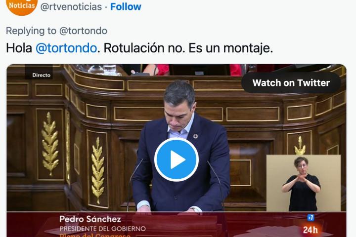 Un rótulo que, tal y como ha confirmado en redes la cuenta oficial de la cadena del ente público, es falso. “Rotulación no. Es un montaje”, ha dicho RTVE Noticias al guionista Javier Durán que aplaudía el texto.