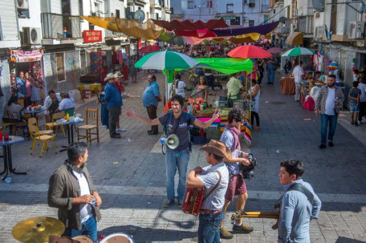 Sin embargo, las calles de estos municipios andaluces poco tienen que ver con su apariencia habitual. La escenografía ubica todas ellas en México y por tanto han instalado puestos de venta callejeros, altares de culto con motivo del Día de los Muertos o banderas de México.