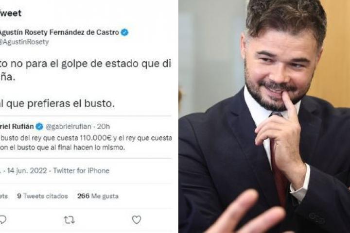“Entre el busto del rey que cuesta 110.000€ y el rey que cuesta 7.700.000€ me quedo con el busto que al final hacen lo mismo”, escribió el diputado de ERC, que recibió la casi inmediata respuesta de Rosety: “El busto no para el golpe de estado que disteis en Cataluña. Normal que prefieras el busto”.