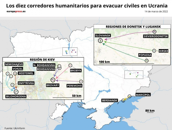 “Corredores verdes de las ciudades: Sumy, Konotop, Shostka, Trostianets, Lebedyn acordados para hoy. Desde las 09:00 hasta las 21:00 horas”, ha anunciado el jefe de la Administración Regional de Sumy, Dimitro Zhivitski, tal y como recoge la agencia de noticias ucraniana Unian.