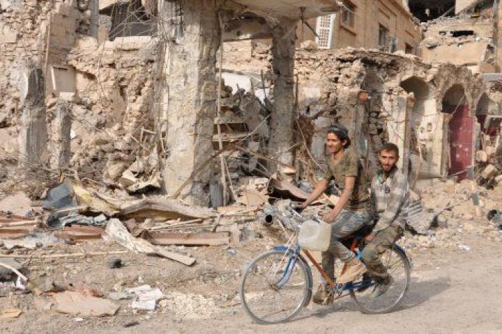 Unos hombres pasan en bicicleta ante las ruinas de un edificio en Deir Ezzor, el pasado noviembre.AFP Contributor via Getty Images