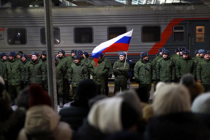 Soldados rusos movilizados este diciembre, despedidos por sus allegados en la estación de tren de Tyumen.via Associated Press