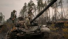 Un militar ucraniano saluda subido a un tanque