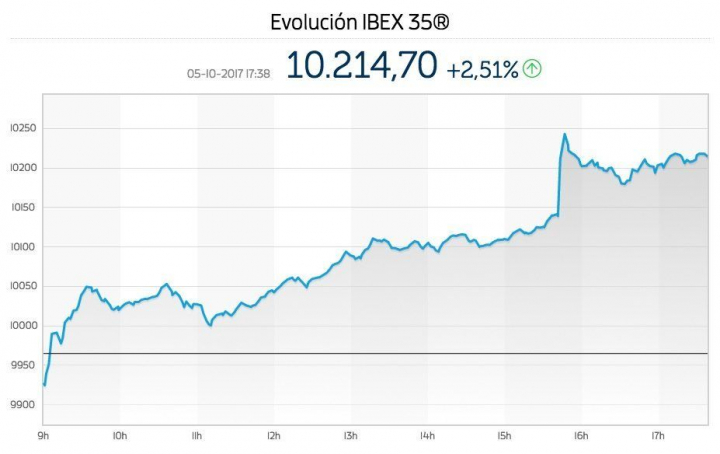 El Ibex recuperó un 2,5% en la sesión de este jueves hasta los 10.198 puntos, después de que el miércoles perdiese un 2,85% (hasta los 9.958 enteros) de su valor por la crisis en Cataluña, la peor caída experimentada por el principal selectivo de la Bolsa española desde el Brexit.