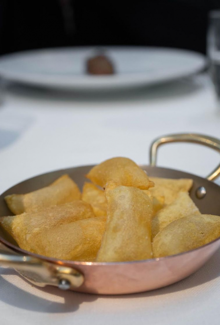 No pude resistirme a un emblema de este tipo de cocina como es el steak tartar, hecho como no, delante del comensal con todo su ritual previo como debe ser. Un aderezo protagonista, donde la yema de huevo le aporta mucha melosidad. Además, este plato lo sirven acompañado de sus patatas souflé, otro símbolo de esa cocina.