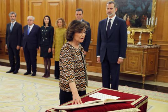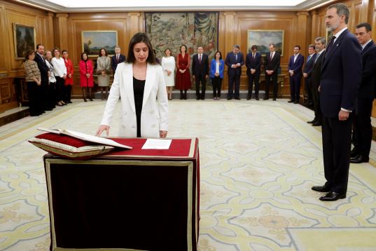 La nueva vicepresidenta de Asuntos Económicos y Transformación Digital, Nadia Calviño jura su cargo durante la jura de ministros del nuevo gobierno en un acto celebrado en el Palacio de Zarzuela en Madrid este lunes 13 de enero de 2020.