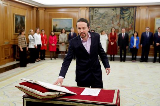 El nuevo vicepresidente de Derechos Sociales y Agenda 2030, Pablo Iglesias jura su cargo durante la jura de ministros del nuevo gobierno en un acto celebrado en el Palacio de Zarzuela en Madrid este lunes 13 de enero de 2020