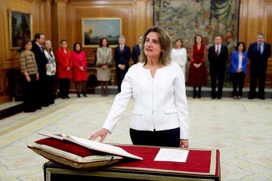 La vicepresidenta de Transición Ecológica y Reto Democrático, Teresa Ribera , jura o promete su cargo ante el rey Felipe VI en el acto de toma de posesión, en el que presidente del Gobierno, Pedro Sánchez, está presente, este lunes en el ...