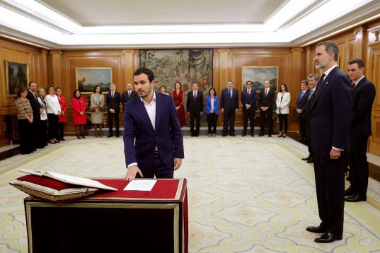 El nuevo ministro de Consumo, Alberto Garzón, jura o promete su cargo en un acto celebrado en el Palacio de Zarzuela en Madrid este lunes 13 de enero de 2020.