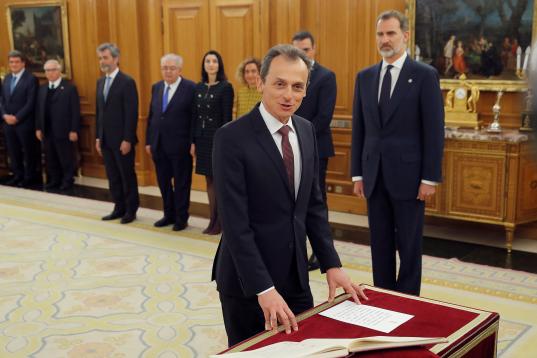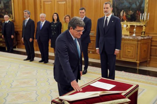 El nuevo ministro de Transportes, Movilidad y Agenda Urbana (antes Fomento), José Luis Ábalos jura su cargo durante un acto celebrado en el Palacio de Zarzuela en Madrid este lunes 13 de enero de 2020.