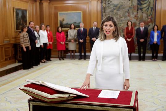 La nueva ministra de Trabajo, Yolanda Díaz, jura o promete su cargo ante el rey durante el acto de toma de posesión del nuevo gobierno, este lunes en el Palacio de la Zarzuela.