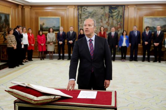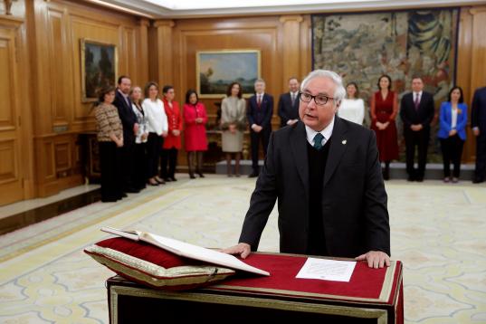 El nuevo ministro de Justicia, Juan Carlos Campo Moreno jura su cargo durante la jura de ministros del nuevo gobierno en un acto celebrado en el Palacio de Zarzuela en Madrid este lunes 13 de enero de 2020.