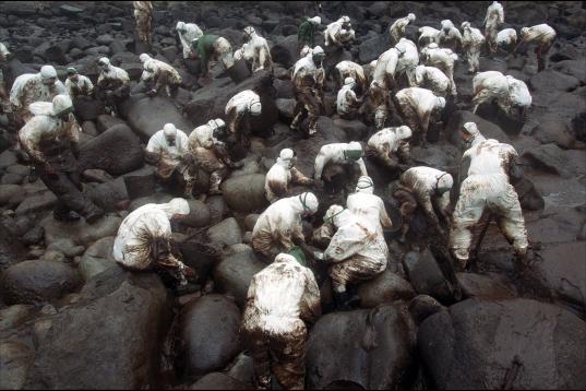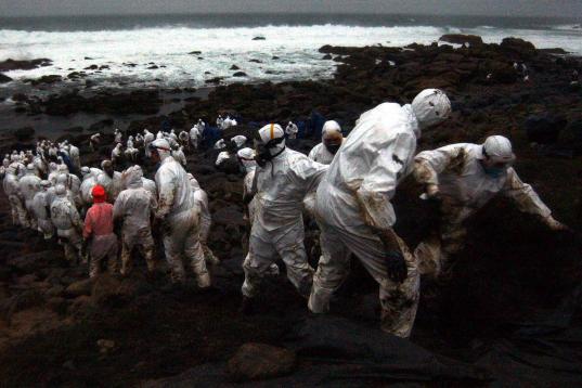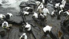 Voluntarios retirando el crudo de las rocas completamente impregnadas.