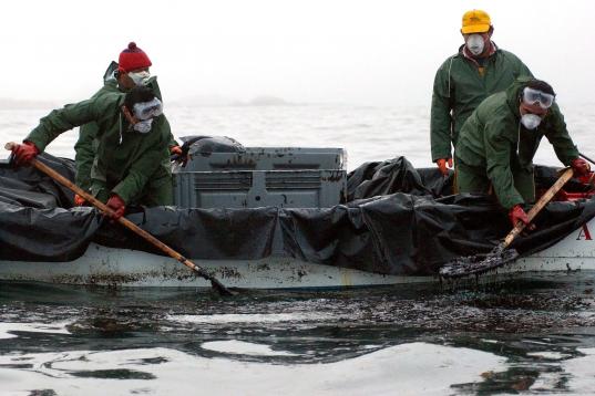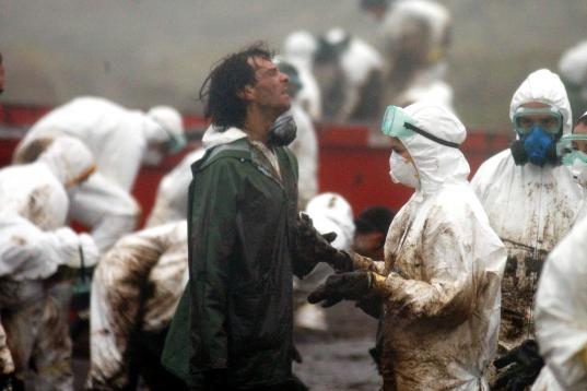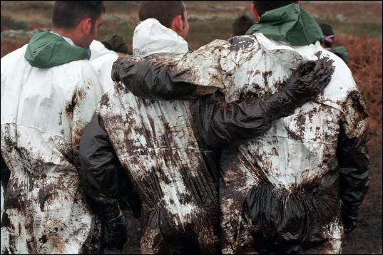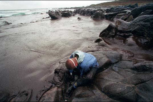 Voluntarios limpiando chapapote el 1 de diciembre de 2002 en Muxía (A Coruña).