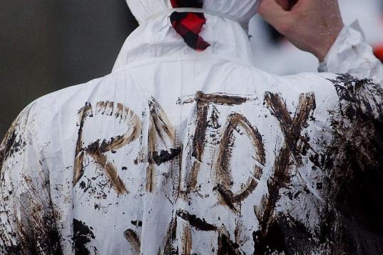 Un voluntario con el siguiente mensaje escrito con fuel en su espalda: "Rajoy, ven".