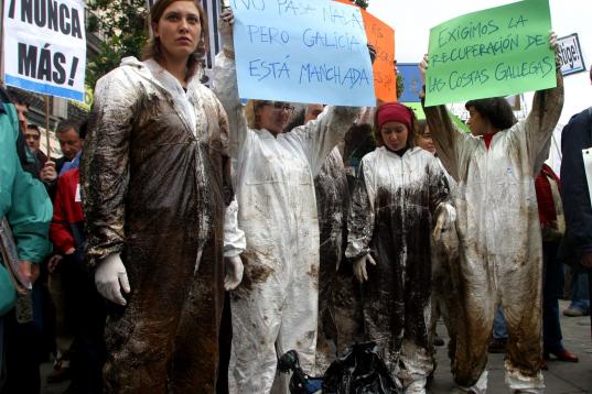 Voluntarios manifestándose en la Puerta de Sol en Madrid, con los trajes manchados de crudo.