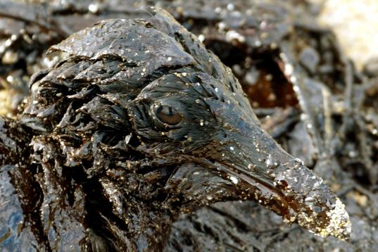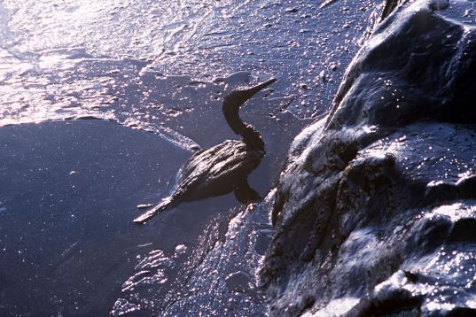 Un ave completamente empapada en chapapote, en la isla de Ons, perteneciente al parque natural de Illas Atlánticas.