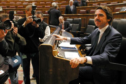 El entonces presidente del Gobierno, José María Aznar, sonriendo a la prensa antes del histórico pleno del Congreso en el que dio explicaciones sobre la gestión de la catástrofe.