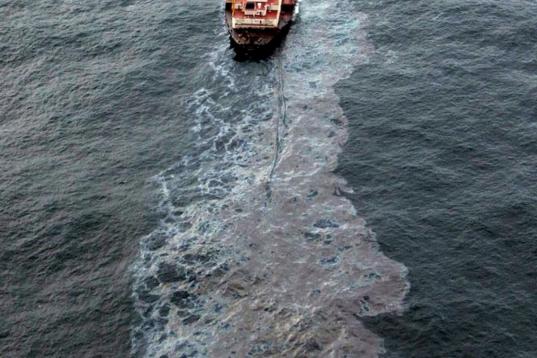 El reguero de fuel que dejaba el petrolero tras abrirse una vía de agua.