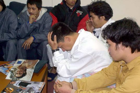 Integrantes de la tripulación del 'Prestige', principalmente de origen filipino, tras ser rescatados del barco.