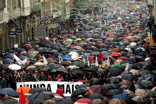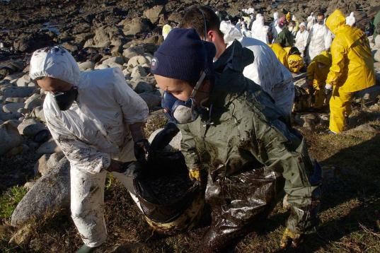 Some of hundreds of volunteers coming from all over of Spain clean the beaches between Oia and Bayona, northwestern Spain, 06 December 2002. Portugal beefed up its anti-pollution measures 05 December as oil slicks from the sunken tanker Prestige...