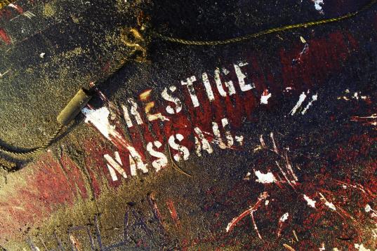 Detalle de uno de los restos del buque, llegado a la localidad coruñesa de Porto do Son en diciembre de 2004.
