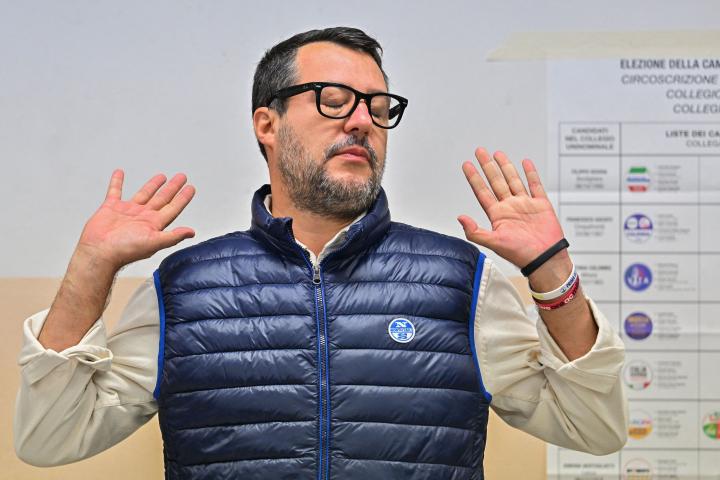 El líder de la soberanista Liga, Matteo Salvini, celebró que la coalición de derechas tiene una amplia ventaja tanto en el Senado como en la Cámara tras los resultados de los sondeos a pie de urna publicados tras el cierre de los colegios electorales, aunque su partido se desplomó por debajo del 10%.