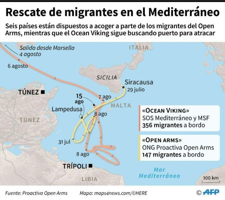 A bordo permanecen, pues, 134 migrantes y refugiados, a la espera de que les asignen un puerto en el que desembarcar, mientras seis países europeos ya han mostrado su disponibilidad a acogerlos y reubicarlos. Casi tocando Lampedusa, con la tierra firme ante sus ojos, pero sin solución por ahora. La desesperación a bordo empieza a rozar lo dramático, con algunos de los rescatados con intenciones de echarse al agua y nadar hasta la costa, algo que los psicólogos y el personal de la nave trata de evitar.
