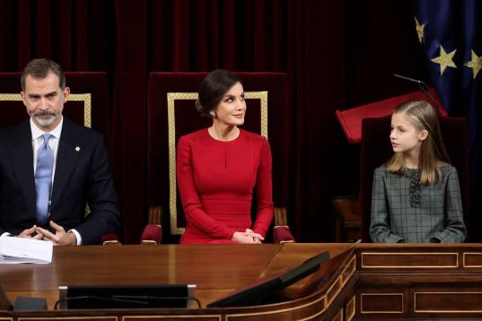GRAF2622. MADRID, 06/12/2018.- El rey Felipe VI, la Reina Letizia, y la Princesa Leonor, en el hemiciclo del Congreso de los Diputados, en el que se celebra esta mañana la solemne conmemoración del 40 aniversario de la Constitución.- EFE/Zipi