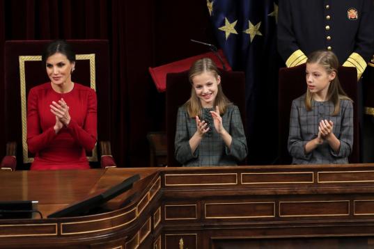 GRAF2618. MADRID, 06/12/2018.- La Reina Letizia, la Princesa Leonor (c) y la Infanta Sofía, en el hemiciclo del Congreso de los Diputados, en el que se celebra esta mañana la solemne conmemoración del 40 aniversario de la Constitución.- EFE/Zipi