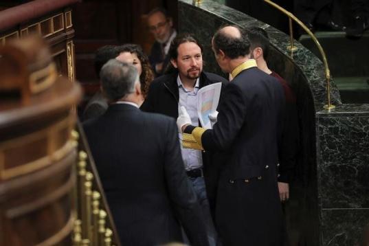 El líder de la formación morada Podemos, Pablo Iglesias, a su llegada al hemiciclo del Congreso de los Diputados, en el que se celebra esta mañana la solemne conmemoración del 40 aniversario de la Constitución. EFE