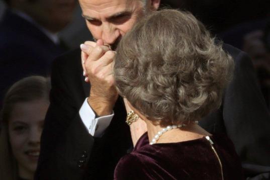 GRAF2568. MADRID, 06/12/2018.- El rey Felipe VI saluda a su madre, Doña Sofía, a su llegada al acto solemne conmemorativo del 40 aniversario de la Constitución, que se celebra hoy en el Congreso. EFE/ Juanjo Martín