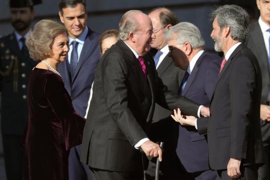 GRAF2569. MADRID, 06/12/2018.- Los Reyes eméritos Juan Carlos y Sofía, saludan al presidente del Tribunal Supremo Carlos Lesmes, en el exterior del Congreso de los Diputados, en el que se celebra esta mañana la solemne conmemoración del 40 a...